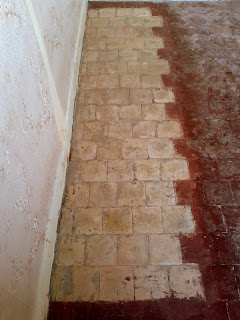 Au final les tomettes décapées sont un peu moches :) pour l'instant! Il y a de nombreuses traces de mortier, ainsi que des tâches blanchâtres. Aussi la présence de nombreux clous saillants entre les dalles gêne le nettoyage.